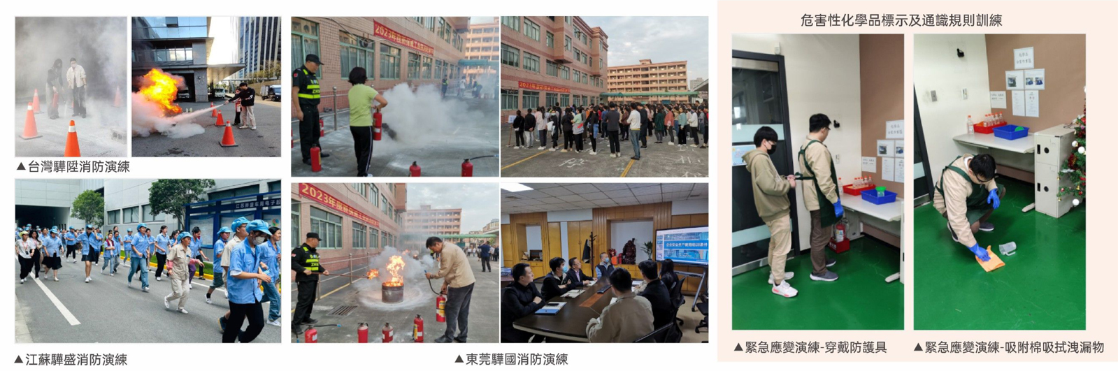 職場安全教育訓練本公司努力減低事業活動的事故風險,系統地、持續地推行安全衛生工作。因此台灣及大陸地區之公司皆訂定相關安全衛生工作守則、緊急應變計劃及風險識別與管理程序,對於危害辯識、事故調查及危害發生時,皆有一定流程之處理及因應方式。定期對全廠人員進行一次緊急應變流程訓練、避難引導、化學品防洩漏演習、宿舍疏散集合訓練,針對員工之逃生時間與集合時間進行演練。 對於可能接觸化學品之人員實施化學品危害觀念建立之教育訓練,使化學品操作者充分知悉化學品特性、相關標示含義、預防性操作措施及緊急洩漏應變處理方式等,培育員工正確的化學品使用認知觀念,防範操作過程中因使用不當而導致火災、爆炸、人員中毒等災害,萬一發生洩漏意外,有立即採取快速有效的緊急應變措施能力,避免災害擴大而損失生命財產,確保工作者、工作場所及附近周遭環境之安全。 2023職安教育訓練: