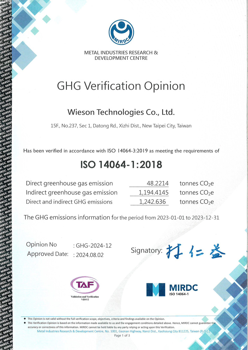 Wieson Technologies has obtained ISO14064-1 Greenhouse Gas Verification Statement