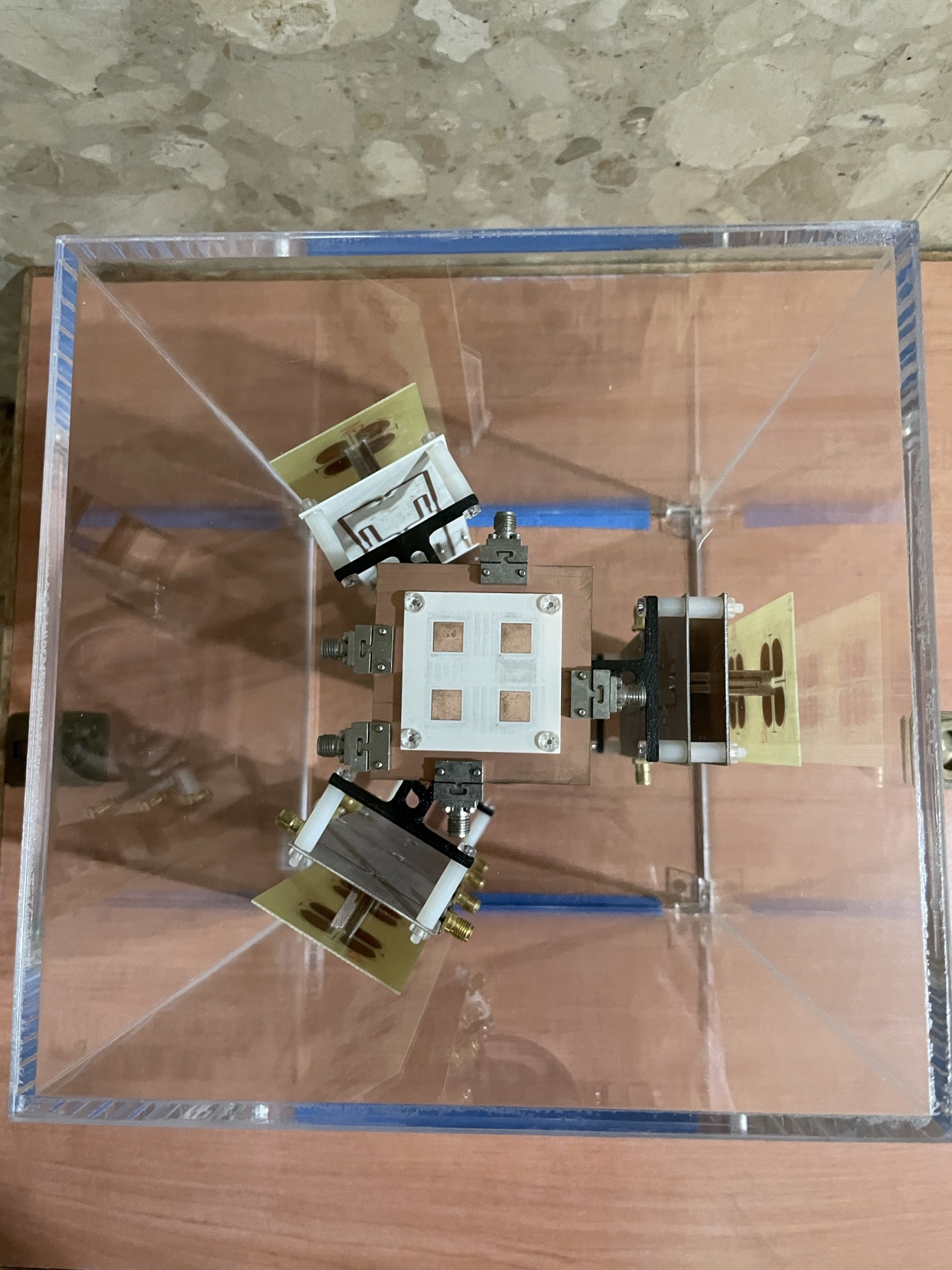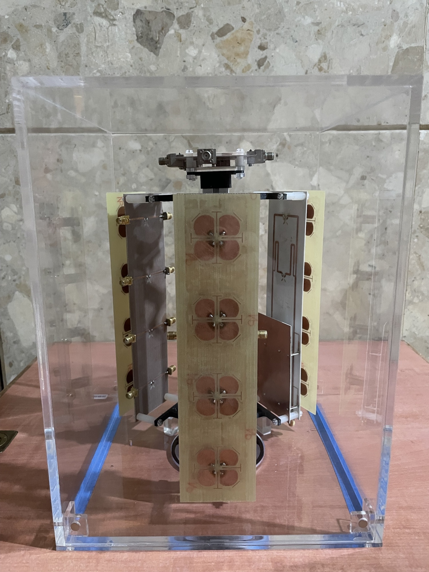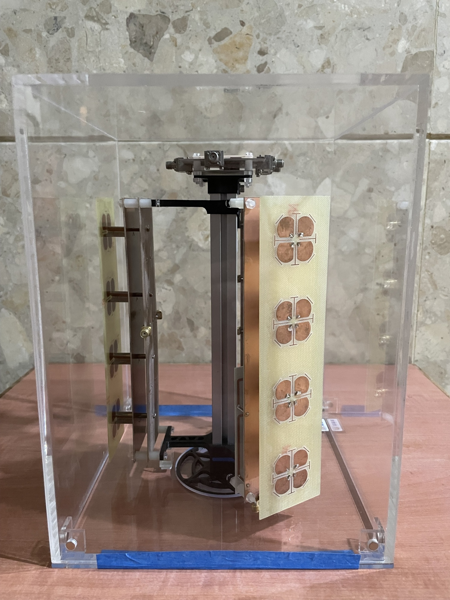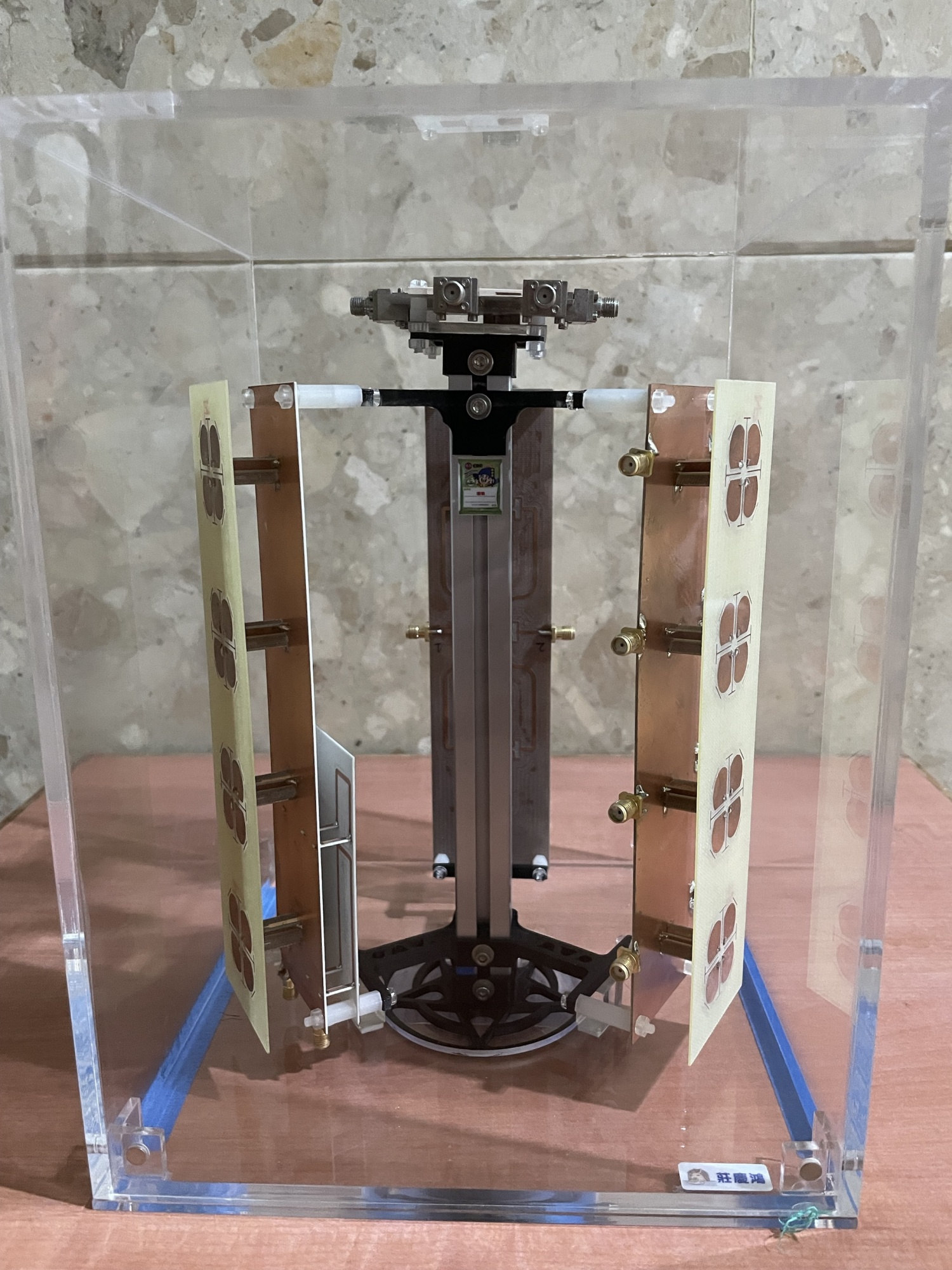 應用於衛星下行Ku頻段(10.7GHz–12.7GHz)的接收天線,採用雙H型槽孔耦合饋入架構進行設計,並透過H型槽孔、空氣層與短節線的精準調校,成功實現寬頻響應與窄波束寬的特性。該設計可大幅提升地面接收站對低軌衛星訊號的接收效率與指向性,滿足日益增長的衛星通訊應用需求。
