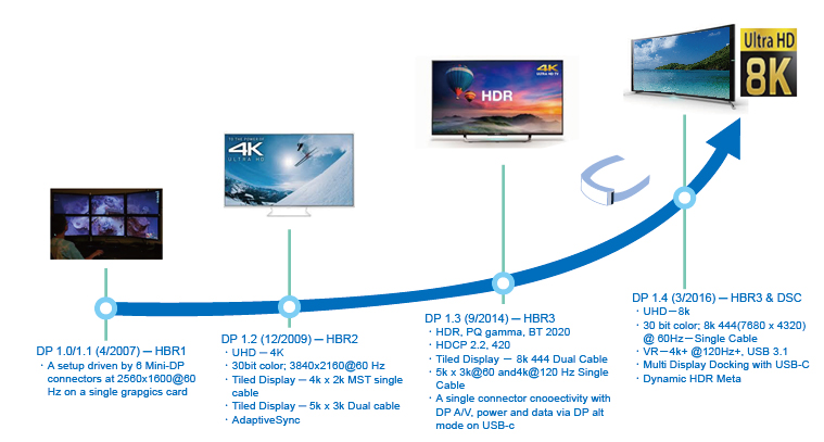DisplayPort 1.4 can support for Display Stream Compression 1.2, Forward Error Correction, and extends the maximum number of inline audio channels to 32, its bandwidth of High Bit Rate 3 (HBR3) connections is 32.4Gpbs, it enables the connection of Displayport supported PC, Laptop or Graphics card to a high resolution (7680×4320 (8K) at 60Hz, 5120×2880 (5K) at 60Hz, 4096×2160 (4K) at 120Hz) Monitor or other Displayport supported device.